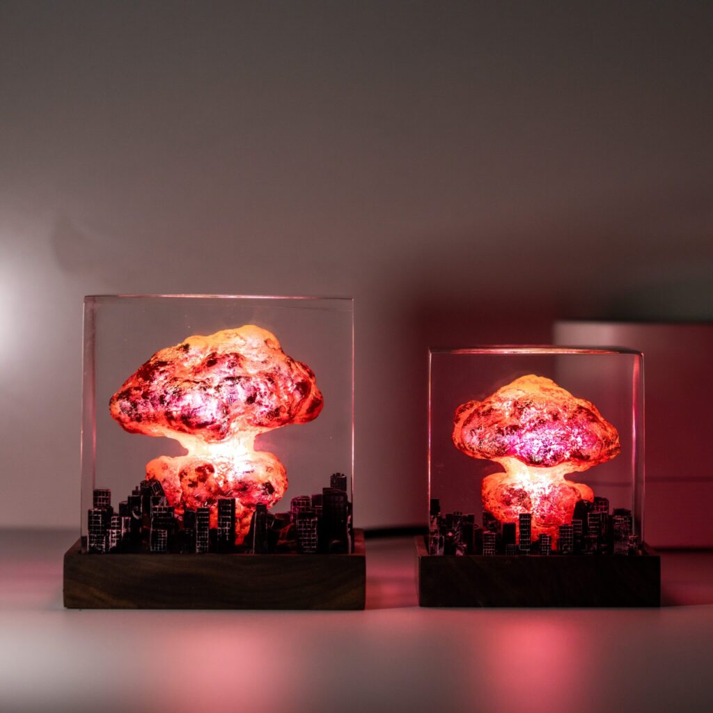 Inspired by the iconic atomic mushroom cloud, this resin lamp captures the moment of an explosion frozen in time. The transparent resin beautifully diffuses the warm LED light, creating stunning shadows and depth—offering a dramatic visual effect while remaining soft enough for cozy spaces.