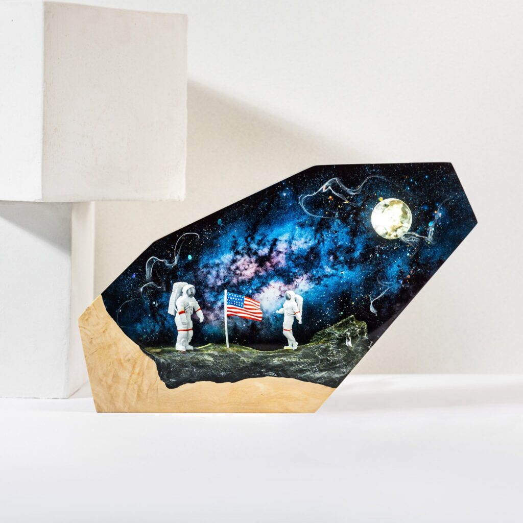 Each Explore The Planets Epoxy Lamp is carefully handcrafted from premium epoxy resin and natural wood. Inside the clear resin, you’ll find an astronaut drifting among planets, stars, and cosmic elements—like a miniature galaxy frozen in time.