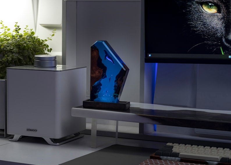 The lamp captures the majesty of the sea. Deep blue resin layers mimic ocean waves, while subtle whale shapes inside evoke calm, depth, and movement. It’s more than lighting—it’s a window into an underwater realm.Ambient & Mood Lighting