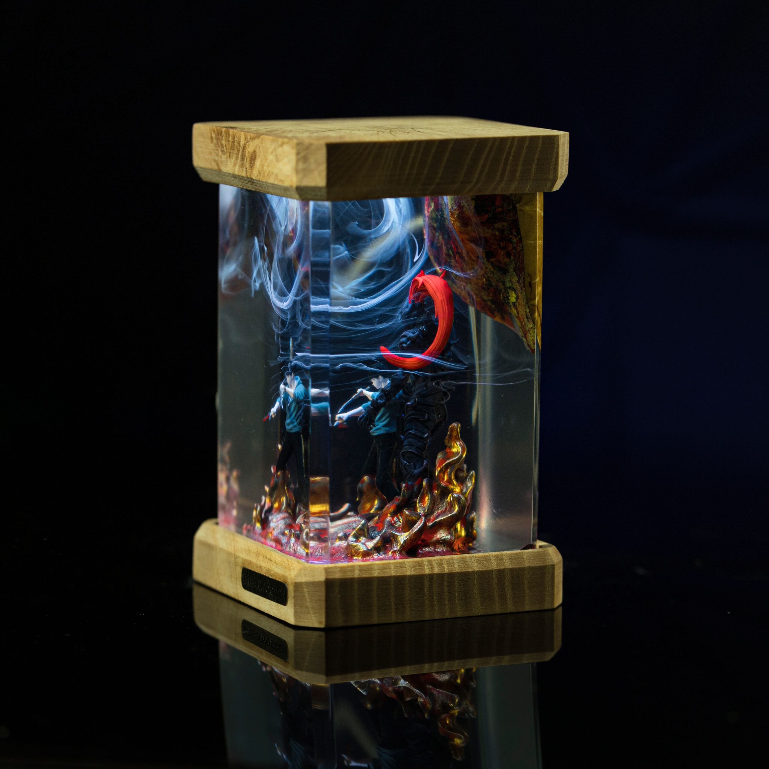 Encased in crystal-clear epoxy and set on a natural wood base, the lamp brings a dynamic diorama to life—where glowing red accents and smoky energy effects create an atmosphere of power and intensity. When lit, the LED reveals the full drama of the scene, perfect for any fan of epic fantasy and anime storytelling.
